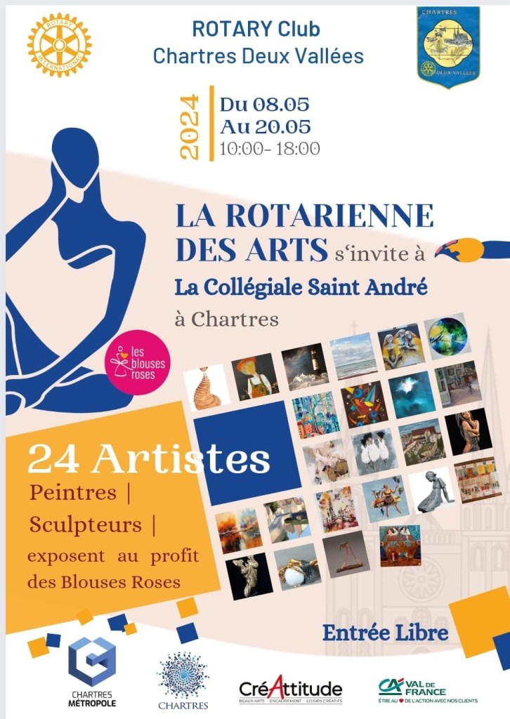 Le Rotary Chartres Deux Vallées a organisé dans la Collégiale Saint-André, sa 1ère édition de la « Rotarienne des Arts ». Elle s’est déroulée du 8 au 20 mai 2024 dans ce lieu emblématique de Chartres, aujourd’hui dédié aux évènements artistiques.
